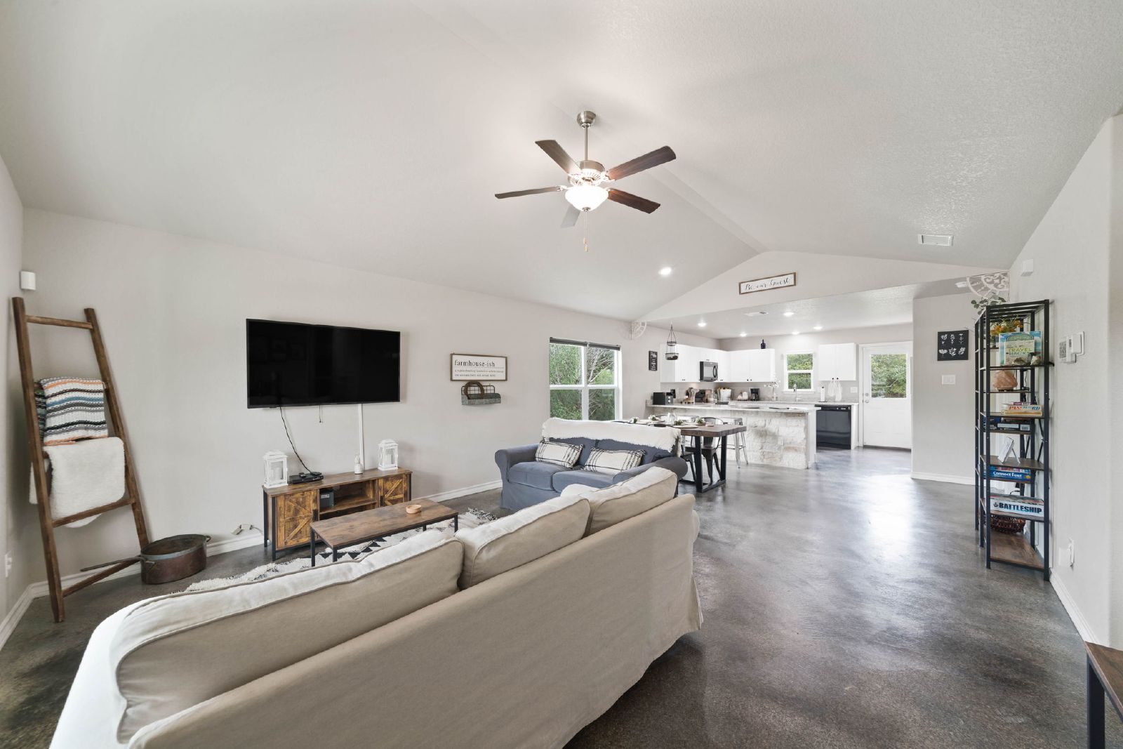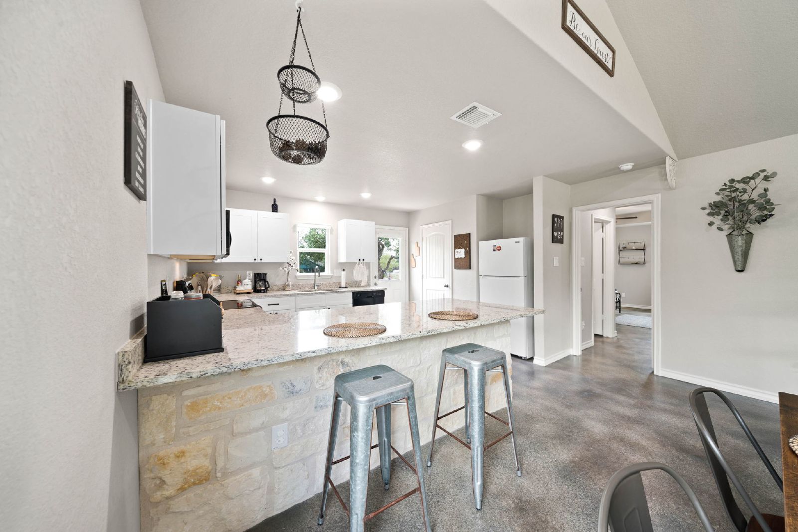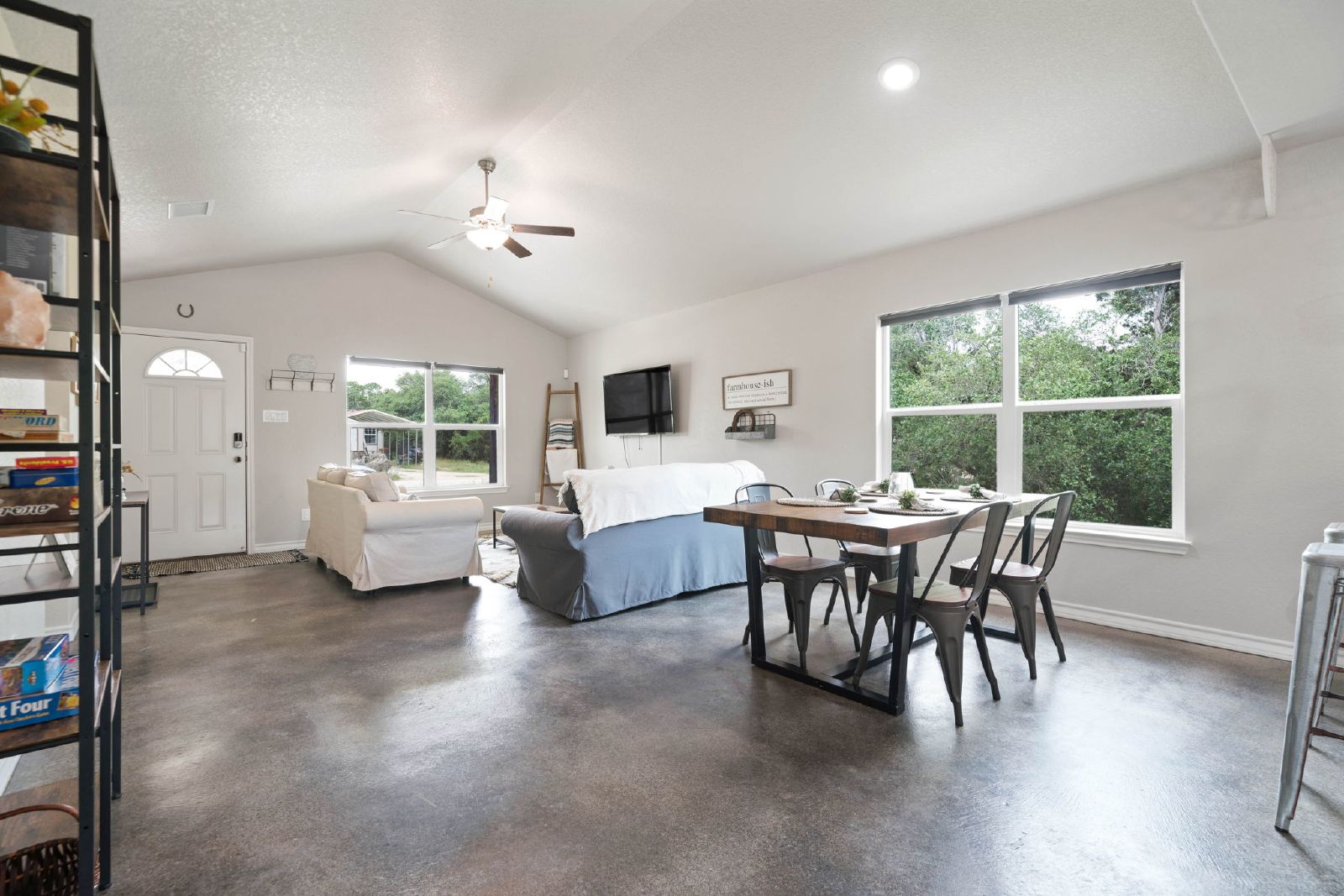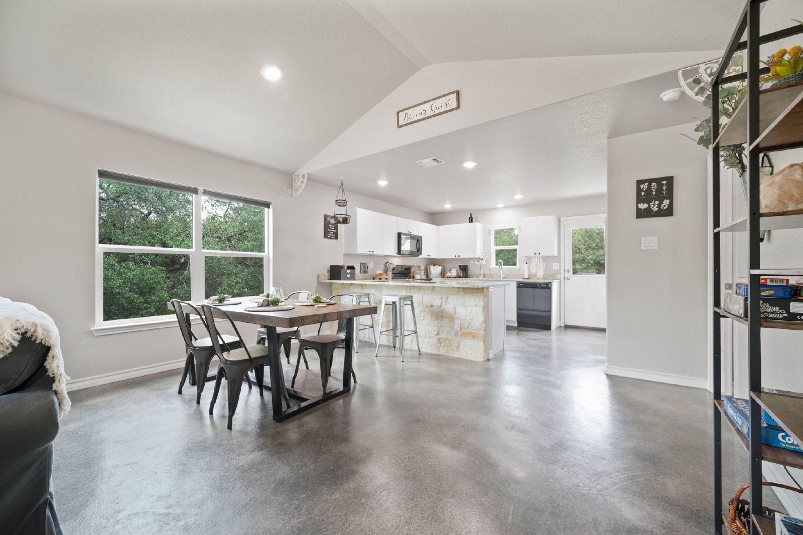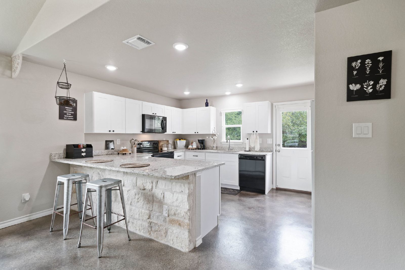 Step into your own slice of tranquility at Canyon Lake, where this inviting property offers a seamless blend of comfort and relaxation, perfect for both personal enjoyment and a lucrative Airbnb venture. This charming 3-bedroom, 2-bathroom home, currently utilized as a delightful short-term rental, is a haven of warmth and hospitality. Outside, the eye-catching rock design of the exterior sets the tone for the cozy ambiance within. As you step onto the welcoming front porch, you're greeted by an open-concept living area that effortlessly merges the living room and kitchen, creating a space that's perfect for socializing and unwinding. The convenient eat-in breakfast area adds to the casual charm, while the expansive master bedroom, complete with an ensuite and walk-in shower, offers a touch of luxury. Another bedroom provides additional sleeping accommodations, and the modern elegance of stained concrete floors runs throughout the home. Step outside to discover a spacious backyard oasis, ideal for relaxation and enjoying the company of furry friends. Positioned for convenience, with easy access to Rebecca Creek Park and its array of activities, including golfing and swimming, this property also benefits from access to a community pool and campsites through the HOA. And with New Braunfels just 25 miles away and the Comal River, a popular spot for river-floating enthusiasts, a mere 26 miles from your doorstep, there's no shortage of nearby attractions. Whether you're seeking a tranquil retreat or a savvy investment opportunity, this Canyon Lake home offers the perfect balance of comfort, convenience, and Texas hospitality. All furnishings are available for purchase separately. Don't miss out on this opportunity.