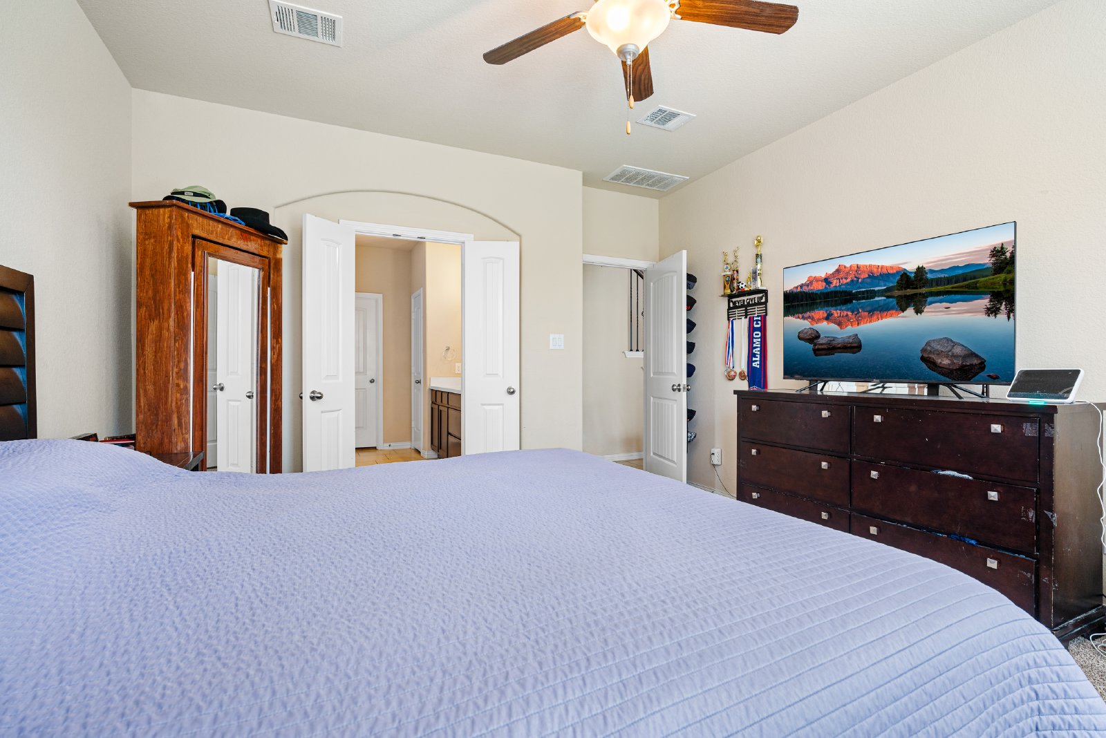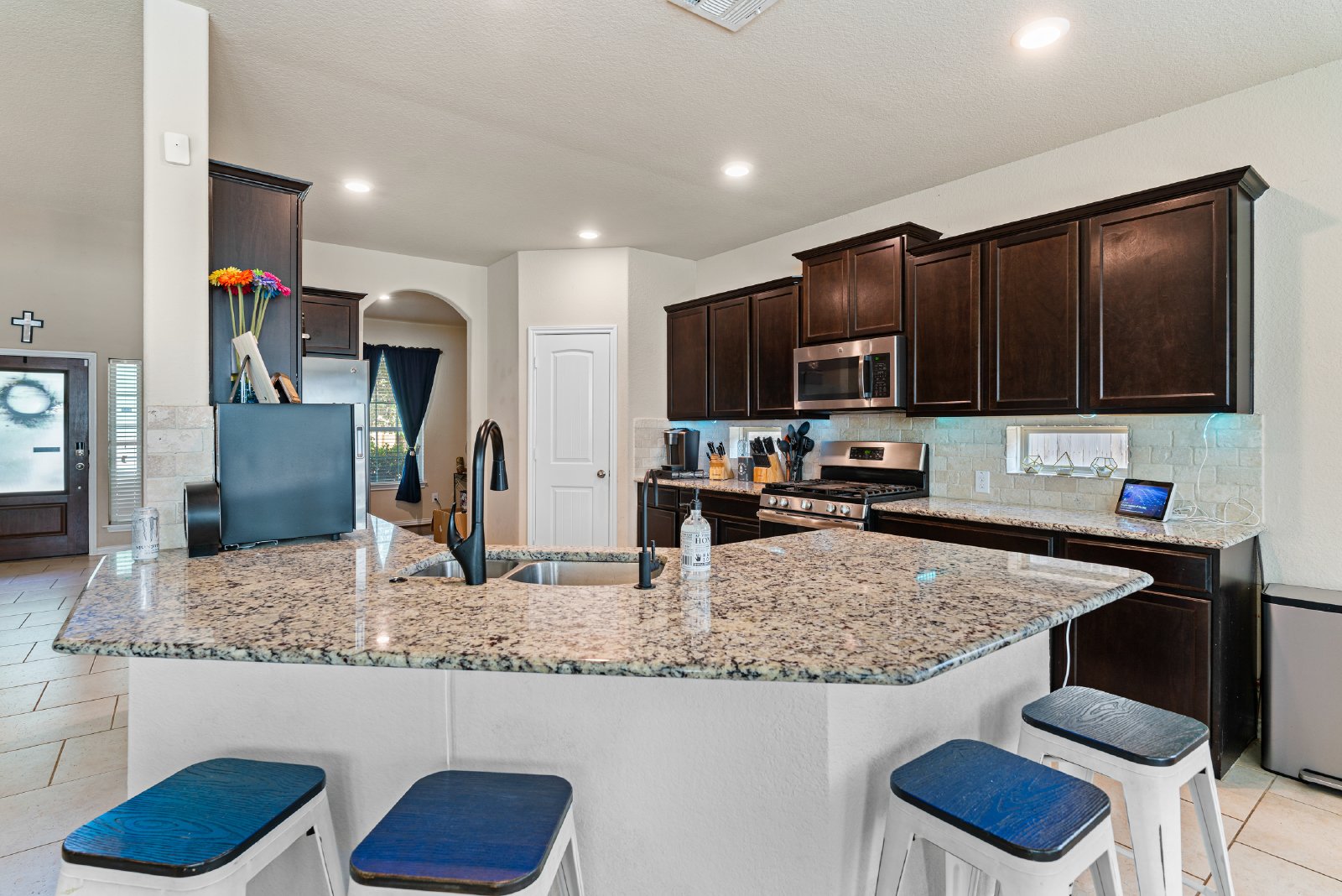 Beautifully maintained home in the desirable Kallison Ranch community featuring a granite island kitchen with stainless steel appliances, reverse osmosis, water softener, and tankless water heater. The main level offers a spacious primary suite with dual vanities and walk-in closet, while upstairs includes four bedrooms, three and a half baths, and a game room with balcony access. Enjoy a private backyard with tiled patio and 8x12 shed with AC, plus recent upgrades including a new roof and HVAC. Community amenities include two pools, pavilion, playground, and dog park. Conveniently located in Northside ISD with Henderson Elementary on-site and easy access to Loop 1604 and Hwy 211.