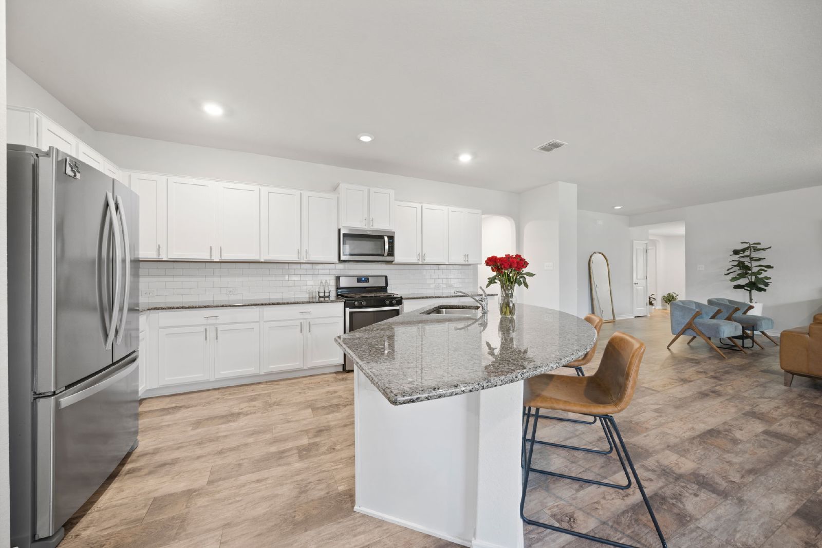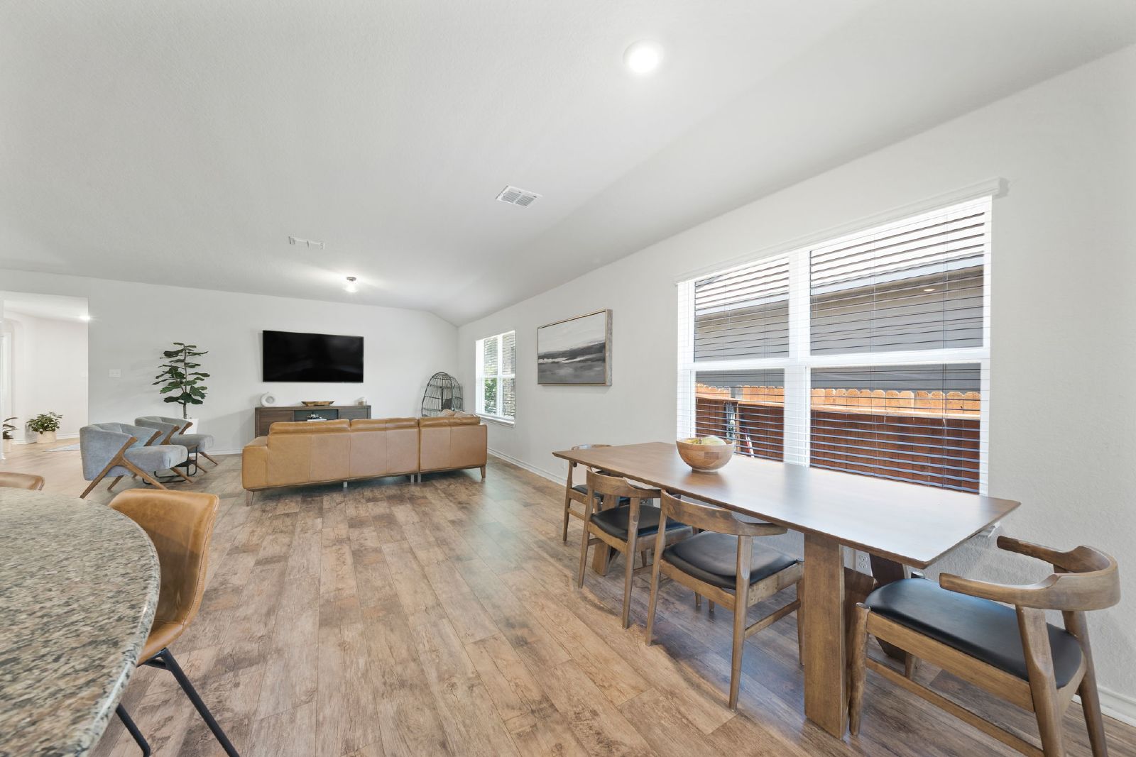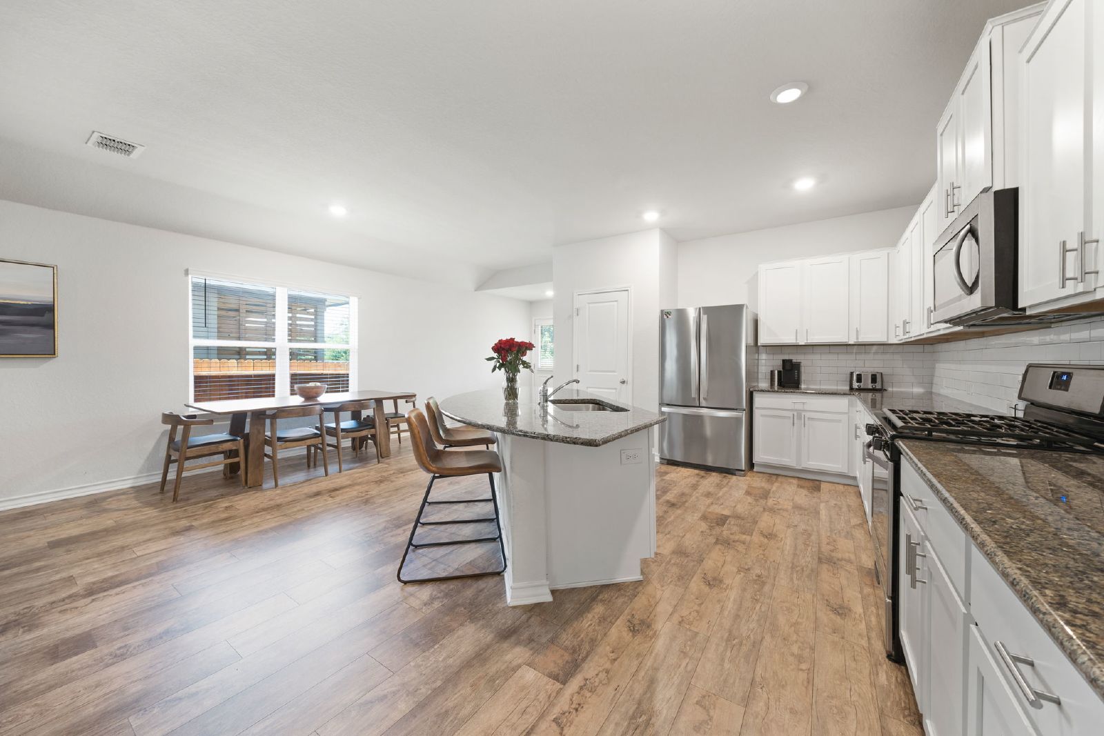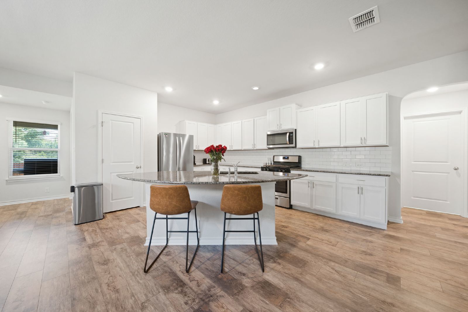 Enjoy the open floor plan that seamlessly connects the living, dining, and kitchen areas—ideal for entertaining and everyday living. The eat-in kitchen offers modern appliances, a generous island, breakfast bar, ample cabinet storage, and expansive countertops.
