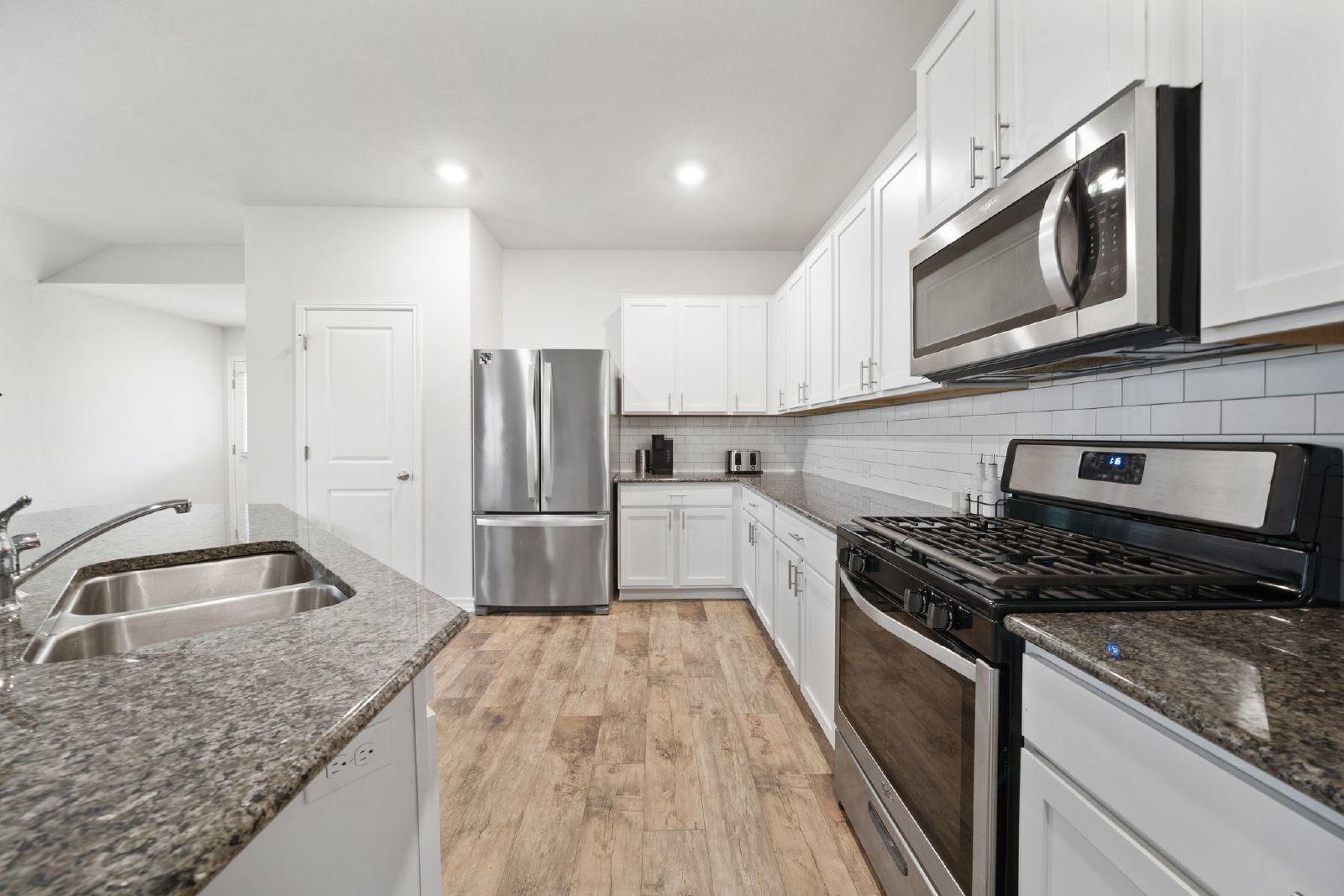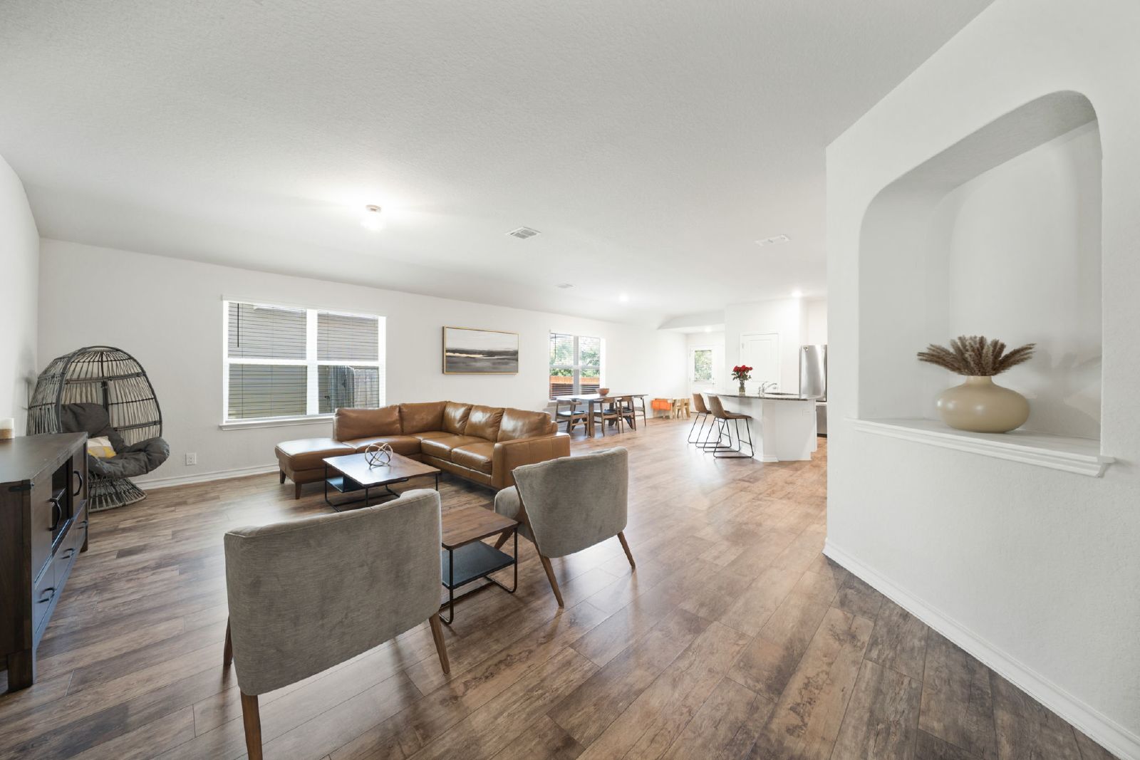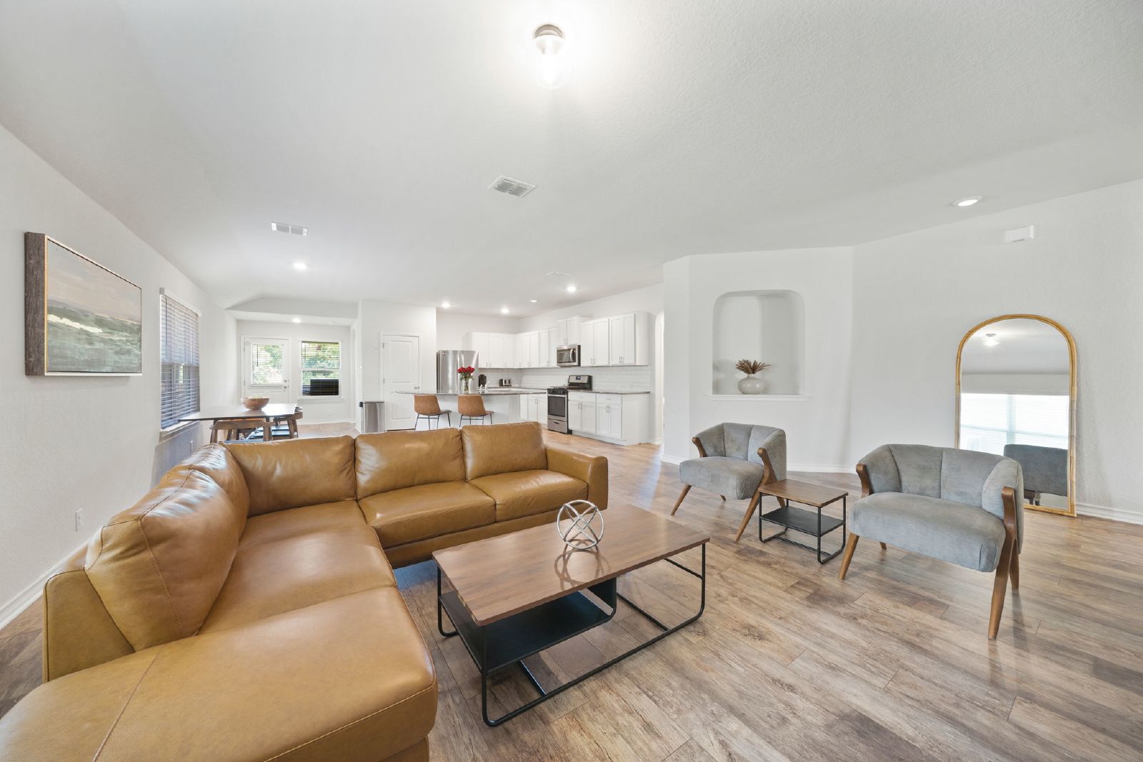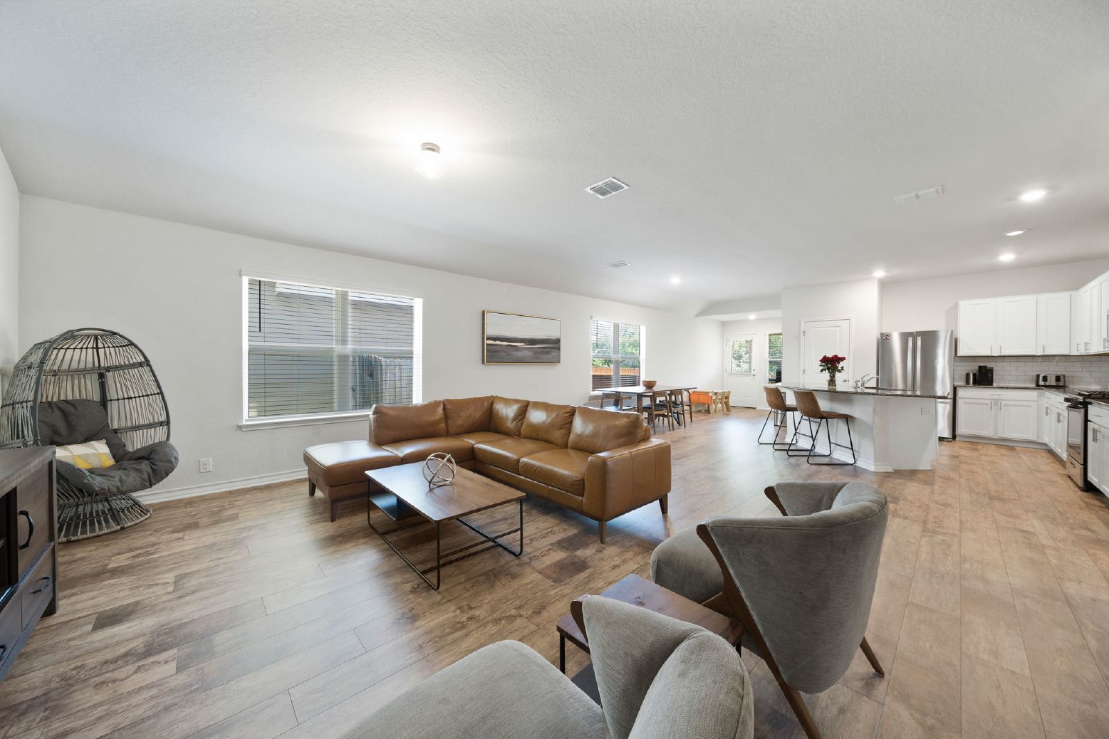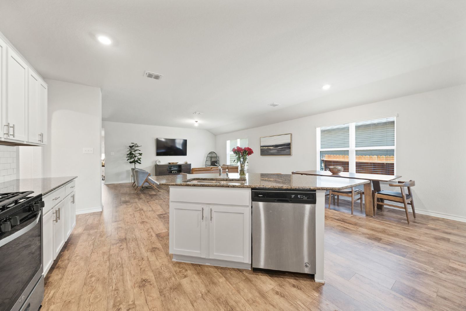 Enjoy the open floor plan that seamlessly connects the living, dining, and kitchen areas—ideal for entertaining and everyday living. The eat-in kitchen offers modern appliances, a generous island, breakfast bar, ample cabinet storage, and expansive countertops.