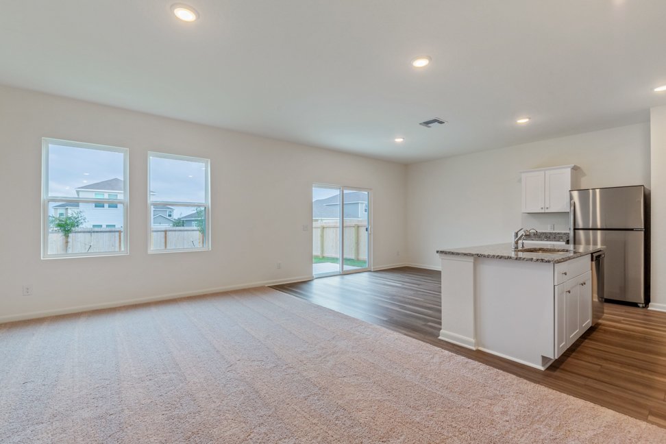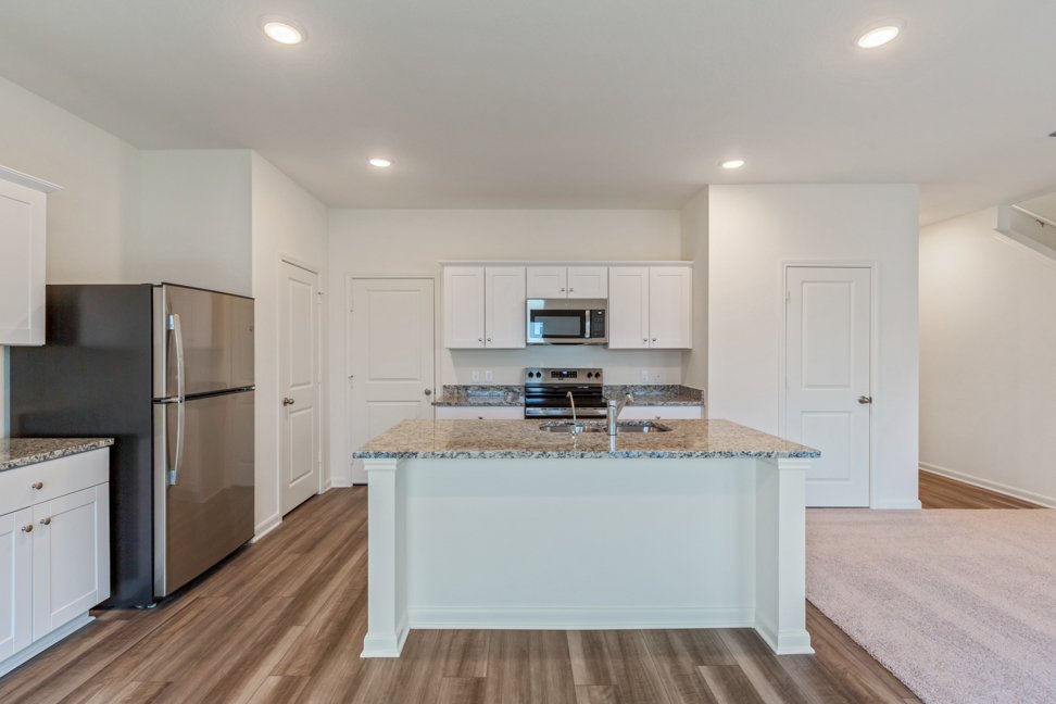 The kitchen features granite countertops, stainless steel appliances, and ample cabinet space, flowing seamlessly into the dining and living areas. Upstairs includes a versatile loft, ideal for a home office or additional living space. The private owner’s suite includes a large walk-in closet and en-suite bath with dual sinks.