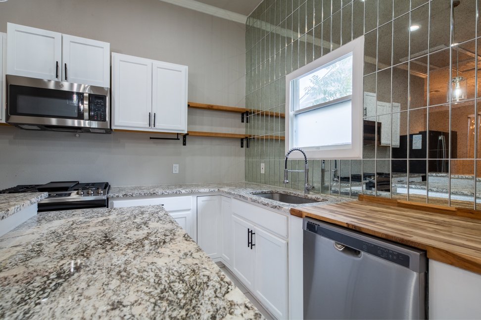 The updated kitchen is a dream—complete with a large island, granite countertops, ample cabinet space, and stainless steel appliances, including a gas stove, French-door refrigerator, and dishwasher.