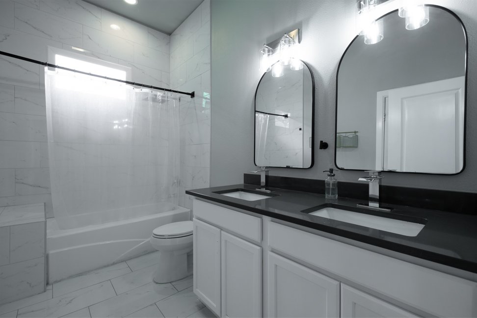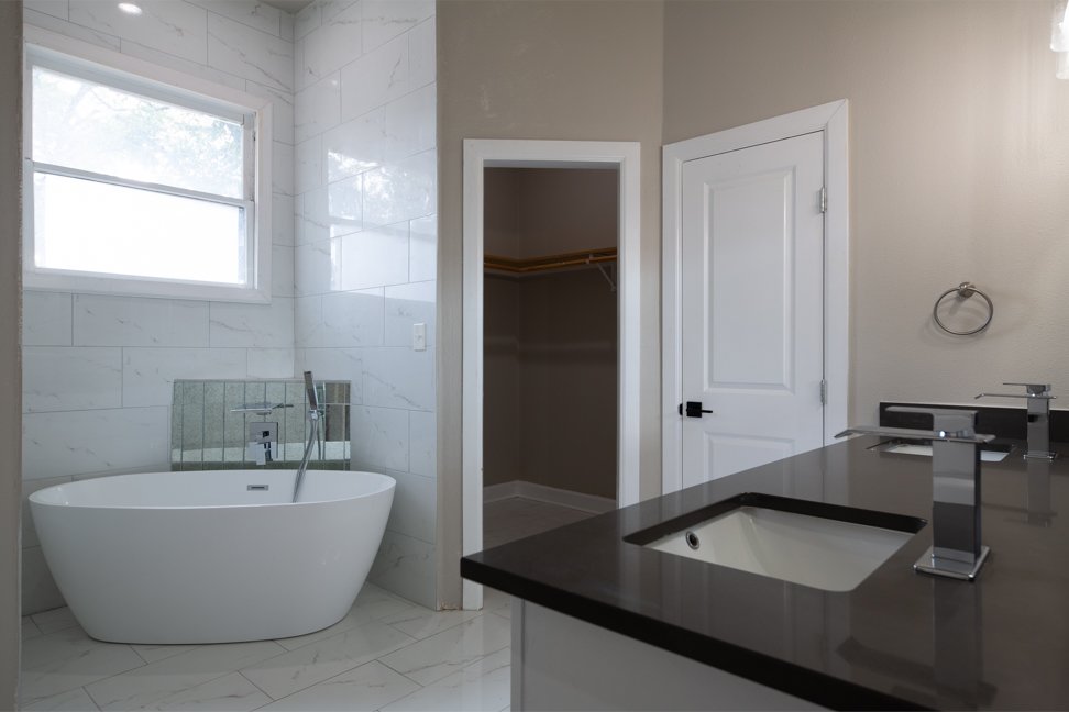 Your primary suite offers a serene retreat, featuring an updated bathroom with a double-sink vanity, standalone soaking tub, walk-in shower, and his-and-hers walk-in closets.